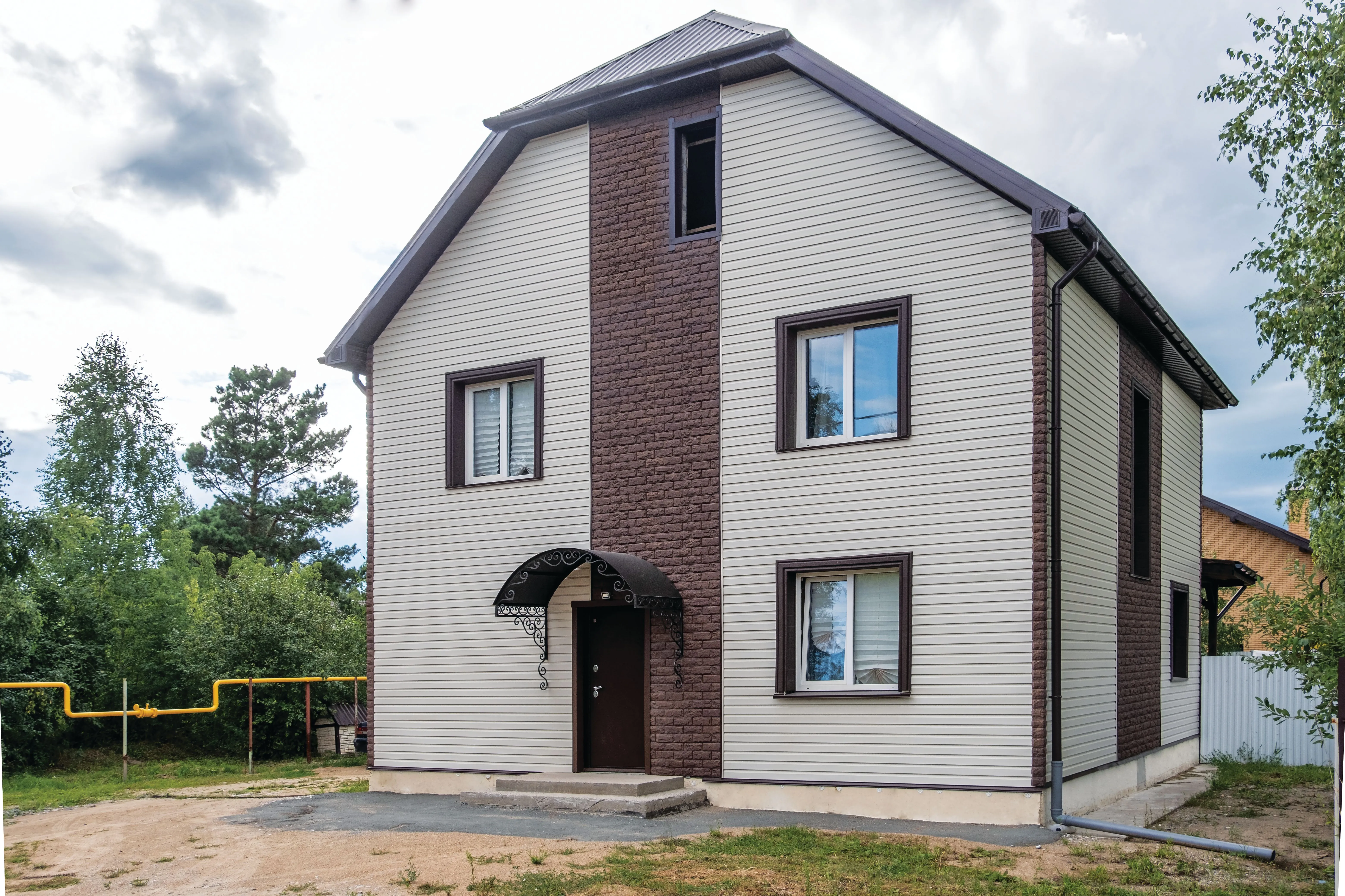 Это еще один дом, в полюбившемся дизайнерском решении оформления фасада классическим сайдингом и фасадными панелями коллекции ФАГОТ. Фактура фасадной панели сочетает в себе структуру кирпичной кладки с текстурой колотого камня. Большая терраса придает дому индивидуальность и неповторимость .